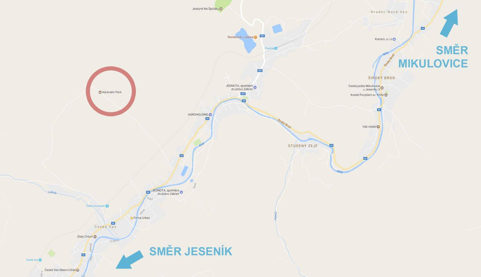 Kde nás najdeteADRENALIN PARK je umístěn na Ranči Orel. GPS: 50°16´24.466" N, 17°13´36.863" E - ukázat na mapě Ranč se nachází v katastru obce Česká Ves v okrese Jeseník v kraji Olomouckém. Pozemnky ranče leží mezi hlavní silnicí I/44 z Jeseníku do Mikulovic a Glucholaz (Polsko) a značenou cyklistickou a turistickou trasu z Priessnitzových léčebných lázní k jeskyním Na Špičáku. AUTEM:Po silnici I/44 z Jeseníku do Mikulovic a Glucholaz (Polsko). Vjezd na ranč se nachází na hranici obcí Česká Ves a Písečná. VLAKEM / AUTOBUSEM:Nejbližší vlaková stanice: Písečná (cca 3 km) Nejbližší autobusová zastávka: Česká Ves, konečná (přímo u odbočky do areálu, 1 km k aktivitám) NA KOLE:Dálková cyklotrasa č. 53 - Moravská stezka, Českomoravská trasa na Jesenicku vedoucí z Králíků přes Hanušovice, Ostružnou, Jeseník, Mikulovice až na hranice do Polska (Glucholazy) PĚŠKY:Turistická trasa (modrá) z Priessnitzových lázní k jeskyním Na Špičáku a Rejvíz. |